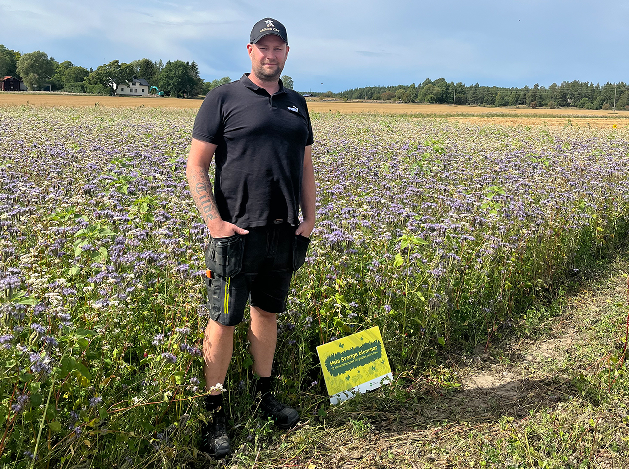 – Det ser alltid väldigt vackert ut jämfört med om det bara skulle växa ogräs i fältkanterna. Vi har sått vissa kantzoner med vallfrö även tidigare, men aldrig med blommande växter innan vi gick med i det här projektet. Det märks att blommorna lockar till sig fler insekter. Det är alltid lika mysigt att höra hur det surrar överallt när man går ut och kollar något i fält. Om det påverkar skördarna också är svårt att mäta, men det känns åtminstone helt klart bättre, säger Tomas.